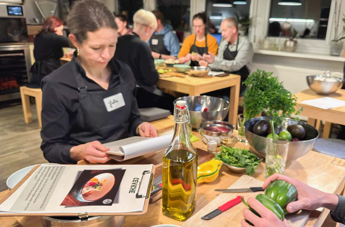 Wird gestellt: Equipment, Schürzen und alle Zutaten für das gemeinsame Kochen eines 3 Gänge-Menüs
