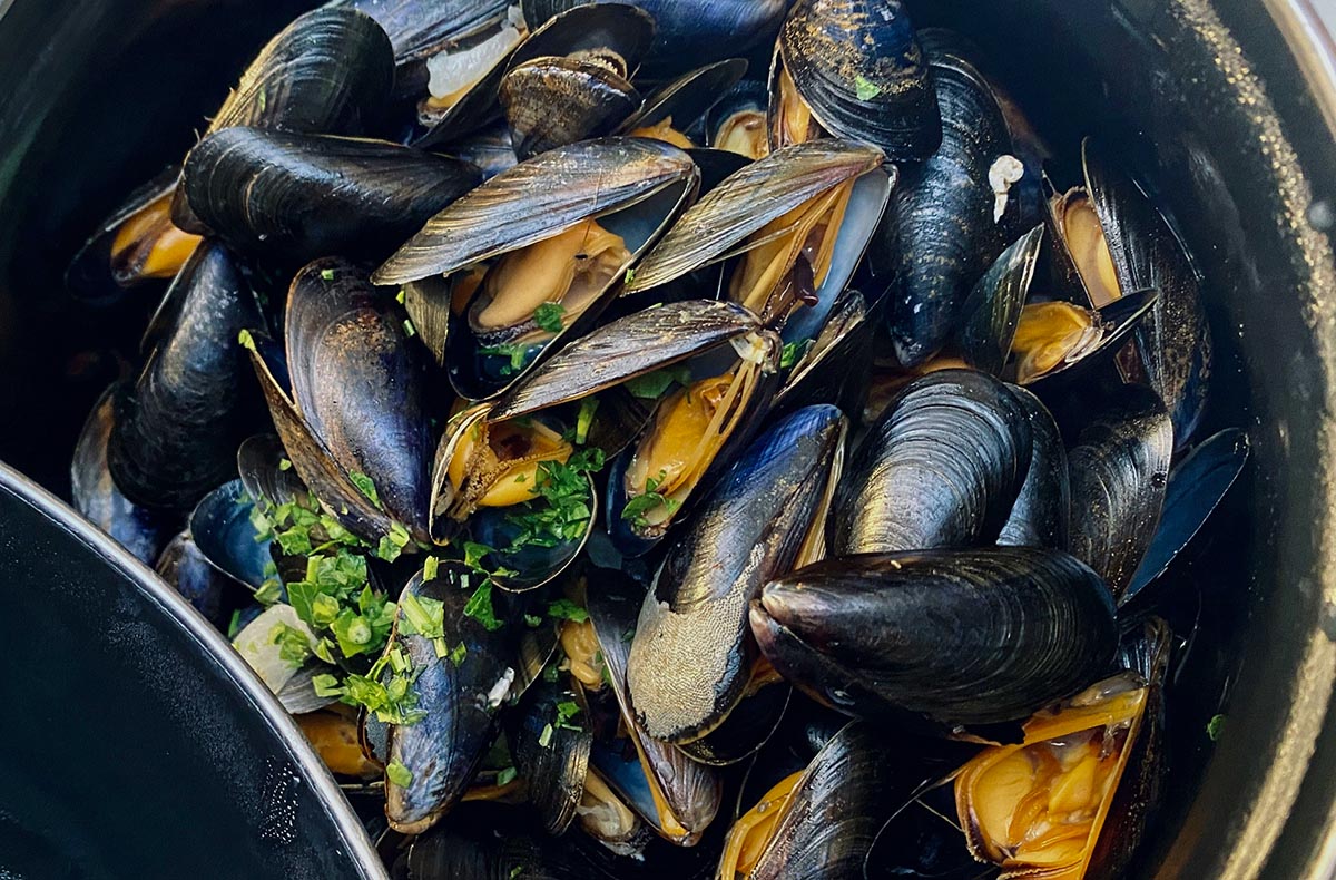 • Zwei Portionen Muscheln je 1 kg (auf Wunsch in Weißwein oder Tomatensud)