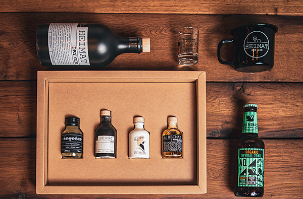 Tastingbox mit 3 Miniaturen à 50 ml (HEIMAT Barrel Aged Dry Gin, HEIMAT vogelfrei alkoholfrei, ingefaer), 1 HEIMAT Dry Gin 500 ml, 1 HEIMAT Tumbler und 3 Mischgetränke