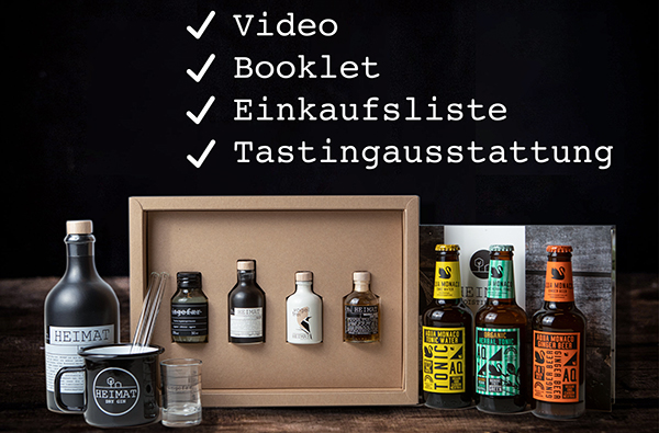Dieses hochprozentige Event macht Dich zu Deinem eigenen Fachmann für die angesagte Kultspirituose! Und alles, was Du dafür brauchst, wird Dir in einer Tastingbox direkt nach Hause geliefert: drei hochklassige Gin-Proben aus eigener Herstellung der HEIMAT-Destillerie, verschiedene Tonic Waters und weitere kleine und große Highlights, die Dein Genießerherz erfreuen, darunter eine exklusive 500-ml-Flasche HEIMAT Gin, diverse Filler und leckeres Ginger Beer.