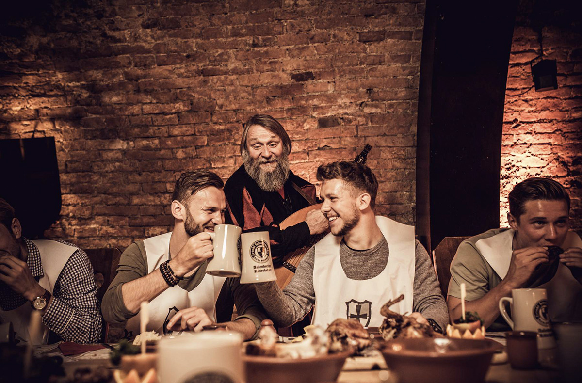 Was steht auf dem Menü beim Rittermahl? Ritter waren körperlich tätig, viel unterwegs auf dem Pferderücken und hatten anspruchsvolle Aufgaben. Wenn sie nach Hause kamen, hatten sie einen Bärenhunger und deshalb sind die Portionen beim Ritteressen üppig. Für Euch wurde ein authentisches 3-Gänge-Menü kredenzt – auf dem Speiseplan stehen deftige Gerichte wie Rinderkraftbrühe, Zwiebelschmalz mit Steinbrot, Haxe vom Schwein, Hähnchenschlegel oder Schweinerippen mit Honig. Bringt also ordentlich Appetit mit zum Ritteressen und genießt den Abend im Burgkeller!