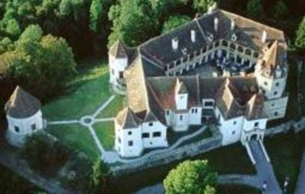 Schauplatz für Euer Ritteressen für Zwei in Feldbach ist das herrschaftliche Schloss Kornberg. Seit Jahrhunderten thront das Anwesen hoch oben in den Hügeln und bildet mit seinen uralten Gemäuern die perfekte Kulisse für eine mittelalterliche Tafelrunde der Extraklasse. Tretet ein und lasst Euch in längst vergessene Welten entführen. Fackeln leuchten Euch den Weg, während Ihr durch die Parkanlage über den Schlossplatz und hinein in den Rittersaal spaziert. Hier erlebt Ihr die Faszination des Mittelalters in all ihren Facetten. Der alte Gewölbekeller des Schlosses heißt nicht nur Rittersaal, sondern ist tatsächlich schon Jahrhunderte alt und wurde früher von echten Rittersleuten bevölkert.