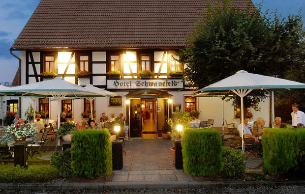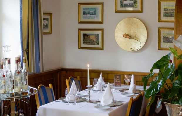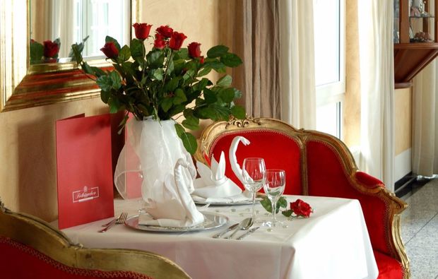 Begrüßt werdet Ihr im gemütlichen Restaurant im Romantik Hotel Schwanenfeld in Meerane nicht nur bereits von einem hübsch gedeckten Tisch und freundlichen, hilfsbereiten Kellnern, sondern auch von einem Glas Sekt, mit dem Ihr auf Euren Abend anstoßen könnt. Bei so einem herzlichen Empfang wird Dein Schatz gar nicht anders können als vor lauter Vorfreude auf den Abend zu strahlen! Genießt das prickelnde Schaumwasser, während Ihr die wunderschöne, romantische Tischdekoration betrachtet. In diesem Restaurant in Meerane kann Euer Candle-Light-Dinner wirklich in absolut stilvoller Atmosphäre stattfinden, schließlich hat sich das in einem niedlichen alten Fachwerkhaus untergebrachte Lokal zu Recht Romantik pur auf die Fahnen geschrieben.