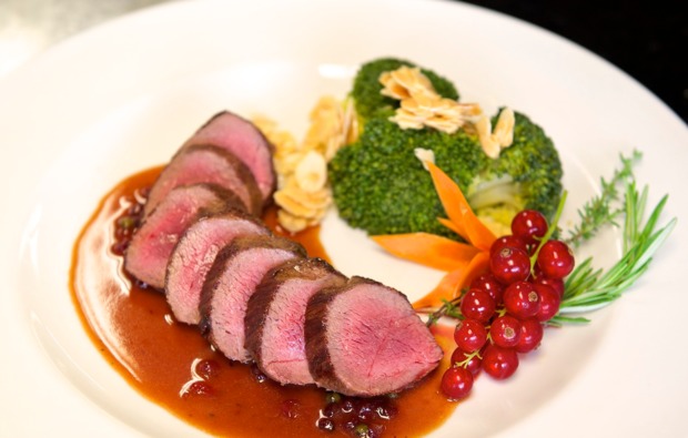 4-Gang-Menü mit Vorspeise, Suppe, 3 Hauptgängen zur Auswahl (Fleisch/Fisch/Vegetarisch), Dessert