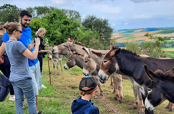 Zur Begrüßung stößt Du mit Deiner Gruppe mit einem Glas Secco an. Dann geht es auch schon los! Mit einem vollgepackten Bollerwagen wandert Ihr 4 bis 6 km entlang der Weinberge. Du genießt die tolle Aussicht und den leckeren Wein. Auf dem Wanderweg kommt Ihr an vielen unterschiedlichen Böden, Rebsorten und Weinlagen vorbei, zu denen Euch auch etwas erklärt wird. Außerdem begegnet Ihr süßen Eseln, die Ihr liebevoll streichelt. Dann kommt das Highlight der Wanderung, das Picknick!