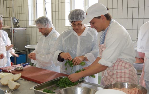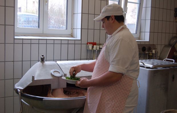Du selbst wirst nun das Brät in die Naturdärme füllen und die Weißwürste per Hand portionieren. Am Anfang bedarf es hier noch ein wenig Fingerspitzengefühl, doch mit ein bisschen Übung wirst Du schnell das nötige Gefühl aufbringen und im Handumdrehen schöne Weißwürste formen können. Selbstverständlich steht Dir die gesamte Zeit der Metzgermeister mit Rat und Tat zur Seite.