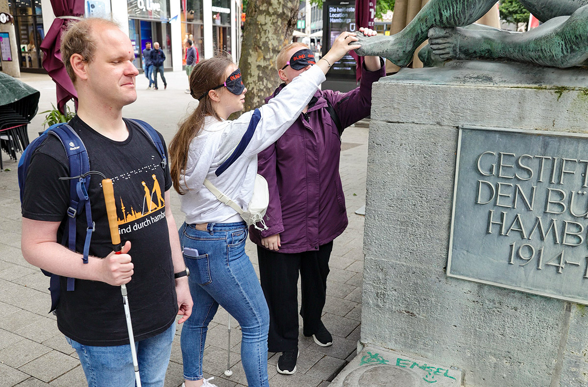 Stadtrundgang durch die Hamburger Innenstadt mit einer Augenbinde und einem Blindenstock