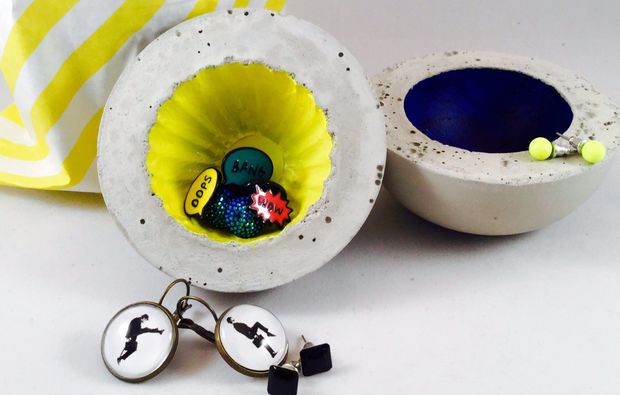 Nun geht es ans Eingemachte: Gieße Deine ganz individuellen Formen aus Beton! Egal ob Kerzenhalter, Schalen, Blumentöpfe, Briefbeschwerer, ... – Du kannst Deine Objekte nach Herzenslust gestalten, denn im Atelier wartet eine große Auswahl an Formen und Zusatzmaterialien auf Dich. Lass Deiner Kreativität freien Lauf! Verpasse zum Beispiel Deinen Objekten mit Farbe und Lack den letzten Schliff. Auch kannst Du Deine Werke veredeln, indem Du Schlagmetall in den Beton gießt oder gleich aus „schick“ mit Metallösen oder Fotohalter-Klemmen „praktisch“ machst. Deiner Fantasie sind hier keine Grenzen gesetzt!