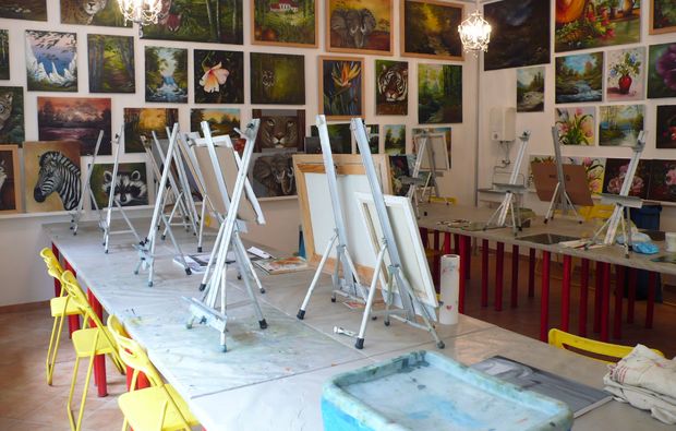 Schauplatz Eures Bob Ross ® Malkurses in Berlin ist das renommierte Atelier Weile. Inhaberin ist Angelika Weile, die seit über zehn Jahren zertifizierte Lehrerin für Landschafts-, Tier- und Blumenmalerei ist. Angelika Weile lehrt Dir heute die Technik von Bob Ross, seines Zeichens weltbekannter Maler von Ölgemälden. Sein Credo: Jeder kann malen. Um die Malerei zu entmystifizieren und der breiten Masse zugänglich zu machen, hat er eigens eine spezielle Technik entwickelt, die das erfolgreiche Gestalten von Ölbildern für jedermann möglich macht. Und genau diese Technik wird Dir im Bob Ross ® Malkurs in Berlin gelehrt. Es handelt sich dabei um eine Nass-in-Nass-Technik, bei der die Farben Schicht für Schicht auf die grundierte Leinwand aufgetragen werden, ohne dass dabei eine Trockenphase notwendig ist. Zur Verfügung stehen Dir 13 Basisfarben – spezielle, satte Töne, mit denen eine unbegrenzte Anzahl von Mischtönen erzeugt werden kann. Ein weiterer Vorteil ist, dass dank der wegfallenden Trockenphasen an einem Tag ein komplettes Gemälde gefertigt werden kann.