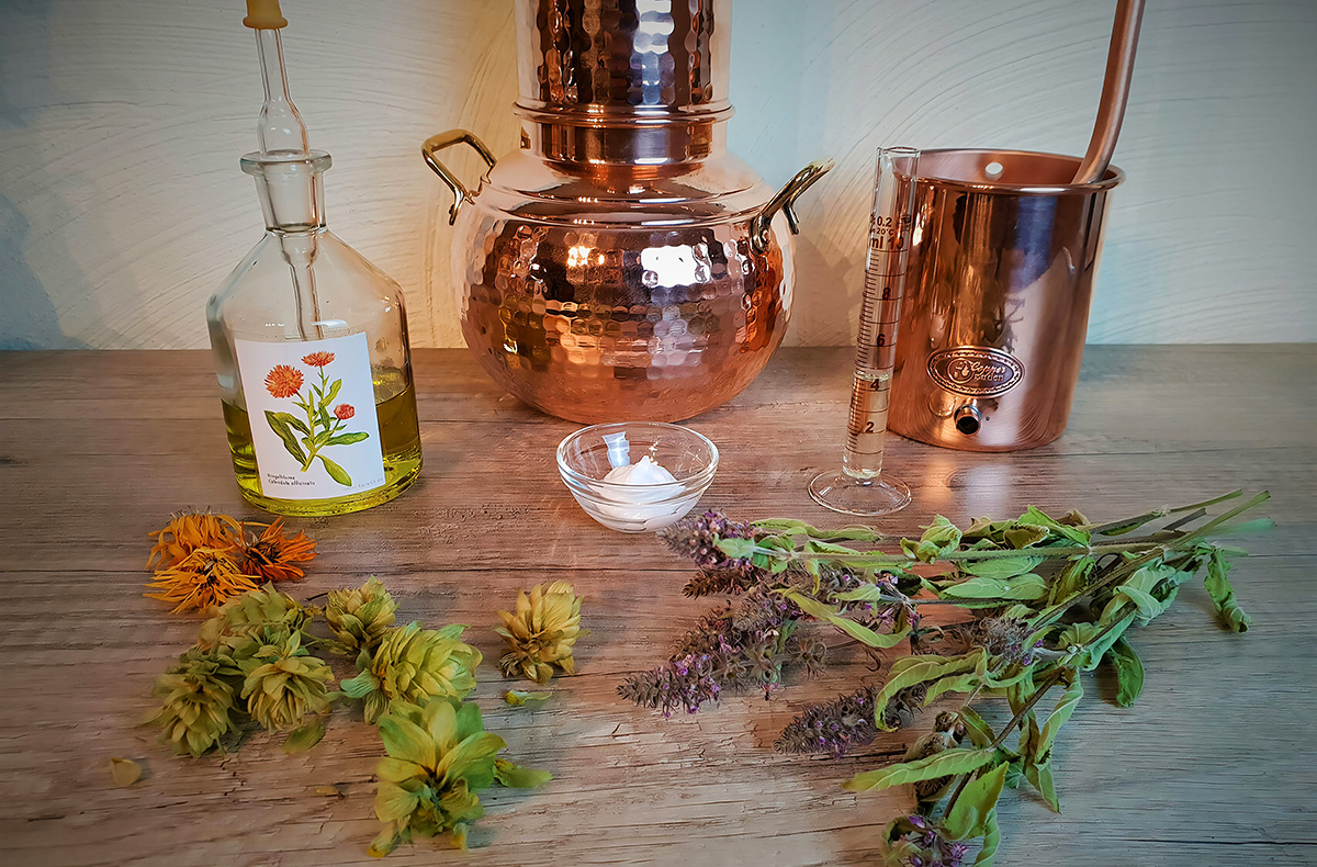 - Sammeln der Zutaten im Duft- und Heilpflanzengarten (je nach Witterung, ansonsten getrocknete Zutaten)