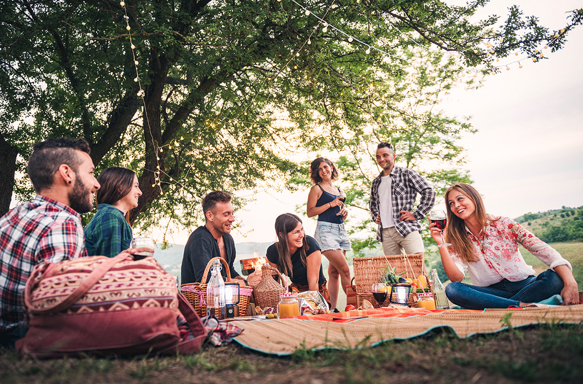 Gefüllter Picknickkorb mit deftigen Speisen und Getränken
