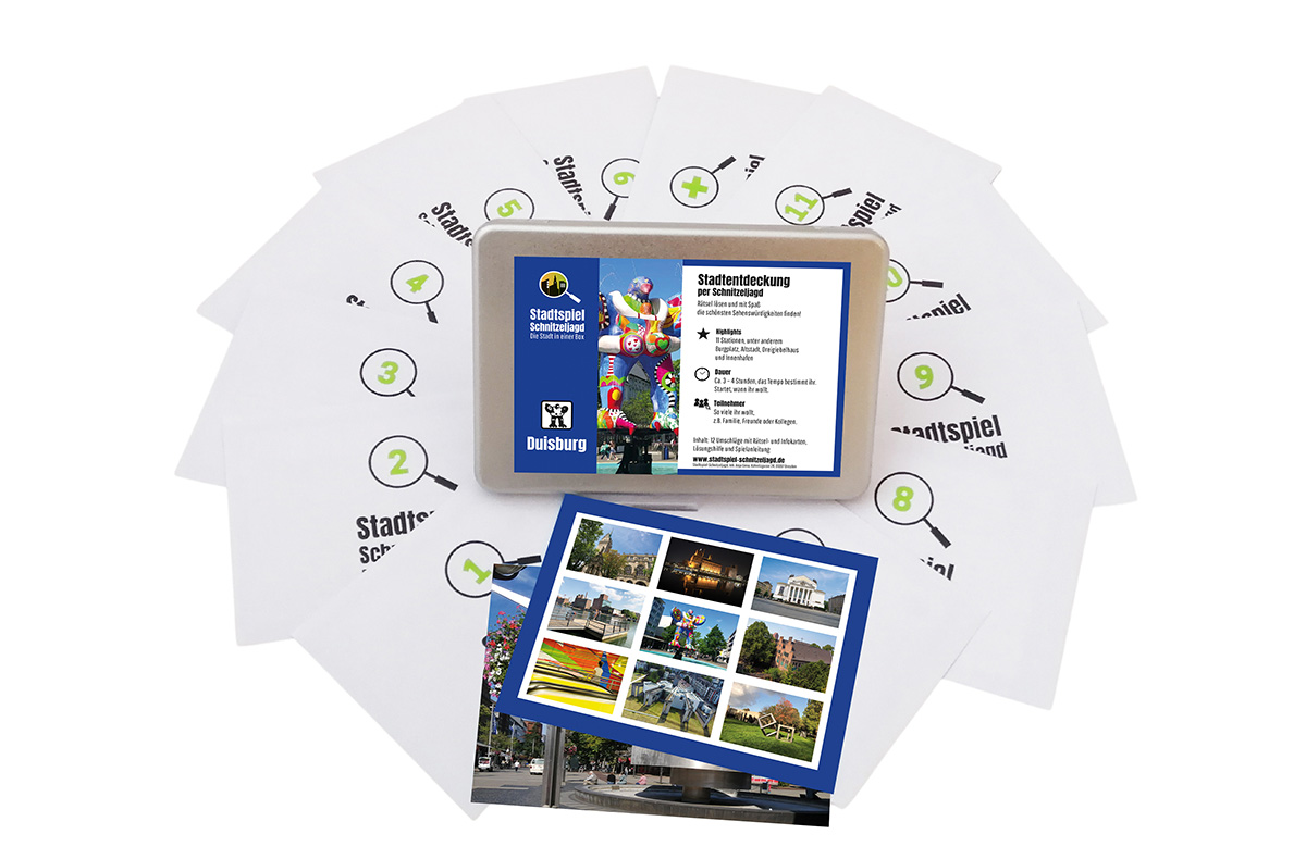 Du machst die Metallbox auf. 11 Umschläge liegen nummeriert und fein säuberlich in der Box. Du nimmst sie mit leuchtenden Augen heraus. Du bist bereit und Deine Abenteuerfreunde sind es auch! Du freust Dich auf die Rätsel, die Ihr gleich gemeinsam lösen werdet. Wo werden sie Euch hinführen? Was gibt es Wissenswertes über die Stadt und Kultur Duisburgs zu erfahren? Du reißt den ersten Umschlag auf und liest laut vor, was auf dem Blatt steht, das Du in den Händen hältst.