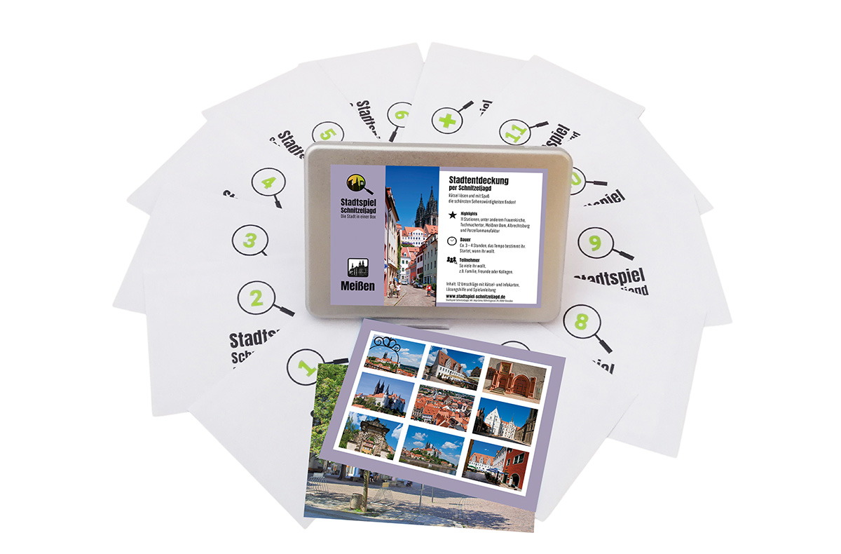 Du bekommst bei der Schnitzeljagd Meißen 11 verschlossene und nummerierte wiederverschließbare Karten mit Rätseln, deren Lösung Euch von Station zu Station führt. Die Stationen sind zahlreiche Sehenswürdigkeiten der wunderschönen sächsischen Stadt, um die sich im Elbtalkessel die Elbe und die Triebisch schmiegen. An jeder Station Deines Stadtspiels durch die Stadt erwarten Dich atemberaubende Bauwerke und spektakuläre Naturdenkmäler. Detaillierte Hintergrundinformationen zur Geschichte und Nutzung der Sehenswürdigkeiten findest Du zusätzlich in den Umschlägen.