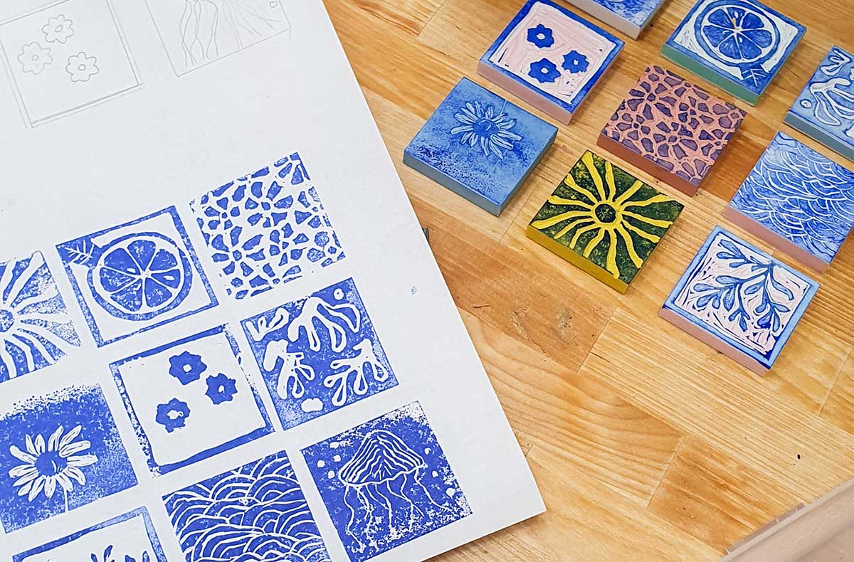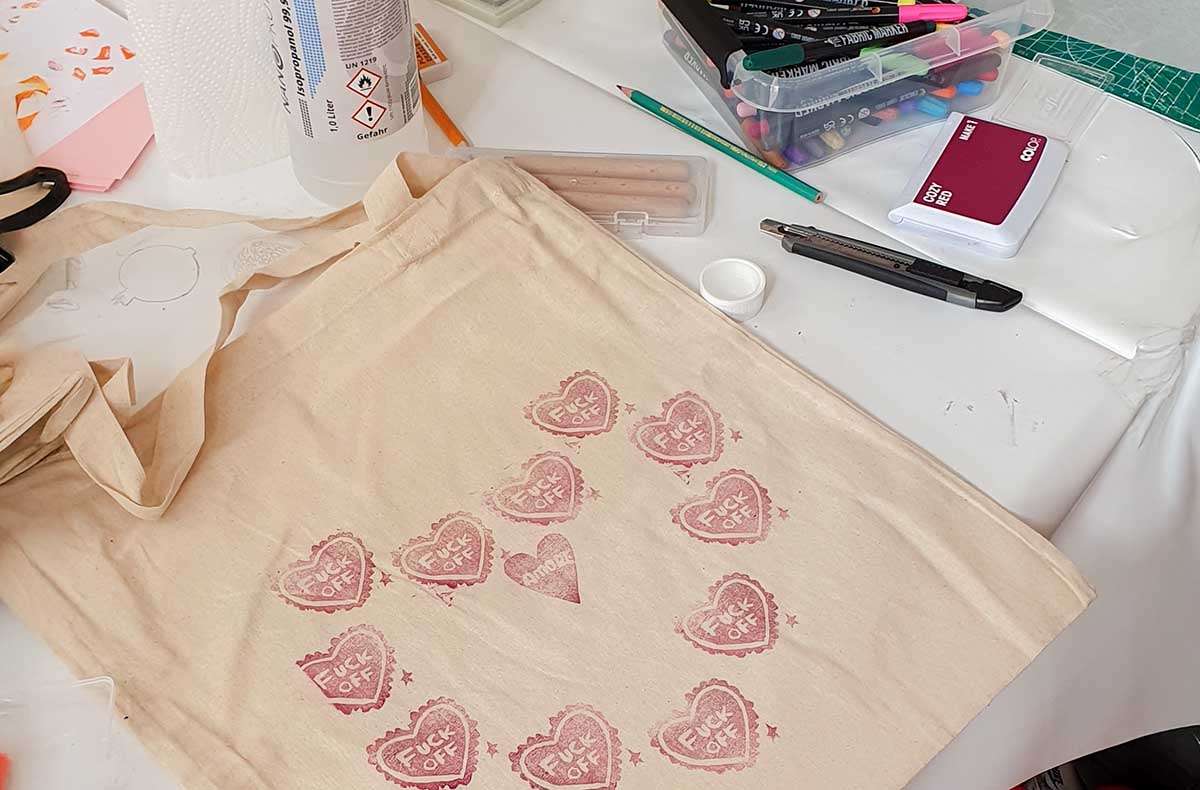 - Erstelle deine eigenen Stempel und bedrucke eine Baumwolltasche sowie verschiedene Papiere, Karten und Umschläge