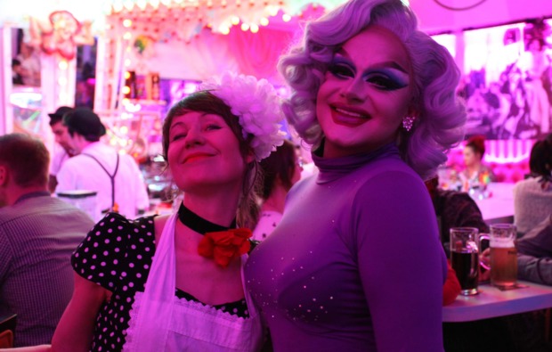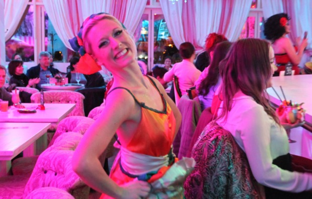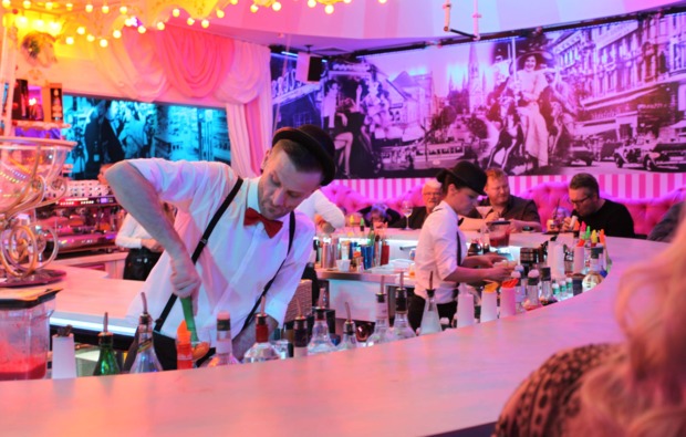 Nur wenige hundert Meter vom Alexanderplatz entfernt scheinen quietsch-bunte Lichter in den grellsten Farben. Das ist die Wilde Matilde! Sobald Ihr den Fuß in die Tür gesetzt habt, kommt das Gefühl in Euch auf, Ihr hättet das Wunderland betreten. Knallige Bonbonfarben und eine Einrichtung im Stil der 20er Jahre verzaubern Euch vom ersten Moment an. Ein besonderes Highlight: Die Bar in Kettenkarussell-Design. Hier werden jeden Abend köstliche Cocktails gemixt und der Tresen zur Showbühne. Der perfekte Ort für eine fantastische Varieté Show in Berlin. In den nächsten vier Stunden wird hier die Nacht zum Tag gemacht und ein Programm der besonderen Art präsentiert.