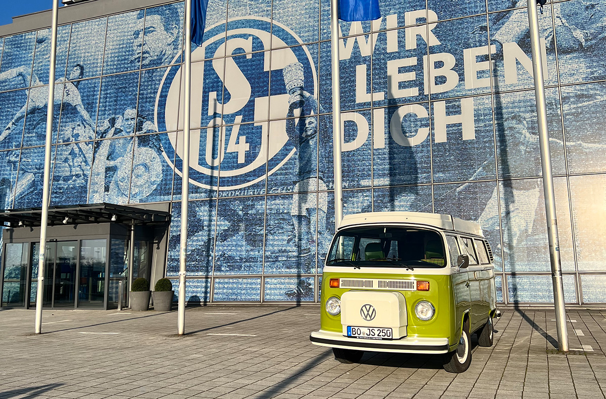 Schenke Deinem Liebsten Schalke04-Fandiese VW Bulli Tour durch Gelsenkirchen und lass Ihn oder Sie dabei das Stadion des legendären Fußballclubs entdecken!