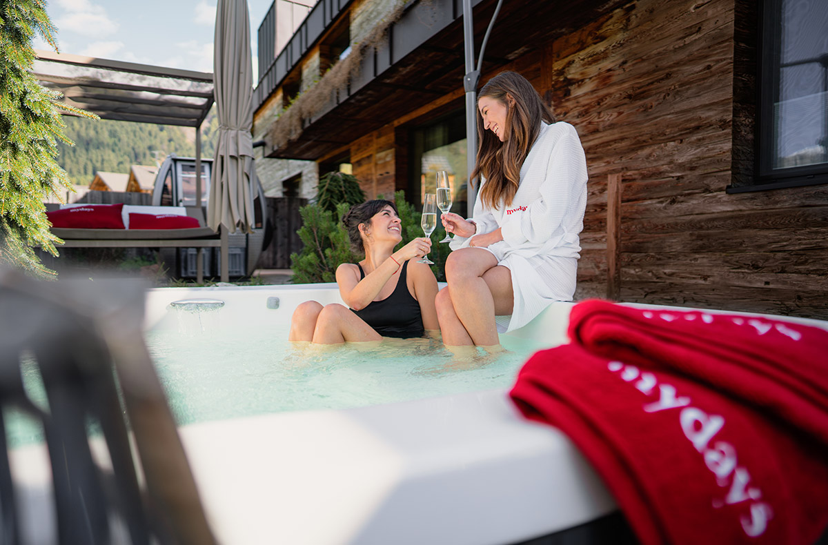 Was gibt es Schöneres nach dem Abendessen, als den Tag mit ein wenig Wellness ausklingen zu lassen? Dafür habt Ihr nicht nur einen privaten Whirlpool, sondern auch eine eigene Gondelsauna. Eine alte Seilbahn-Kabine, in der Ihr beim Aufguss das wunderschöne Bergpanorama bestaunen könnt. Euer Frühstück könnt Ihr selbst auswählen und nach einer entspannten Nacht wird es Euch direkt ins Chalet geliefert.