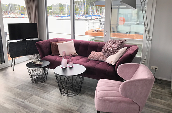 Mit Fußbodenheizung im Bad, Soundsystem und Hightech-Küchennische ist in Eurem schwimmenden Zuhause für jeglichen Komfort gesorgt. Luxuriöser lässt es sich nicht urlauben. Auf dem Sofa mit 180-Grad-Blick aufs Wasser könnt Ihr ausgiebig kuscheln, Kaffee trinken oder Lieblingsschmöker lesen. Oder Ihr seht den vielen Wasservögeln zu, die gemächlich auf dem See ihre Bahnen ziehen. Herrlich entschleunigend! Nutzt Euren Kurzurlaub im Floating Village auf dem Brombachsee, um die Seele baumeln zu lassen und ganz viel Natur zu genießen. Ohne auf Annehmlichkeiten zu verzichten oder zu frieren, denn Euer Luxus-Hausboot verfügt über einen wärmenden Gaskamin. Falls verfügbar, könnt Ihr auch ein Apartment mit echtem Kamin bewohnen und abends ein gemütliches Feuer schüren.