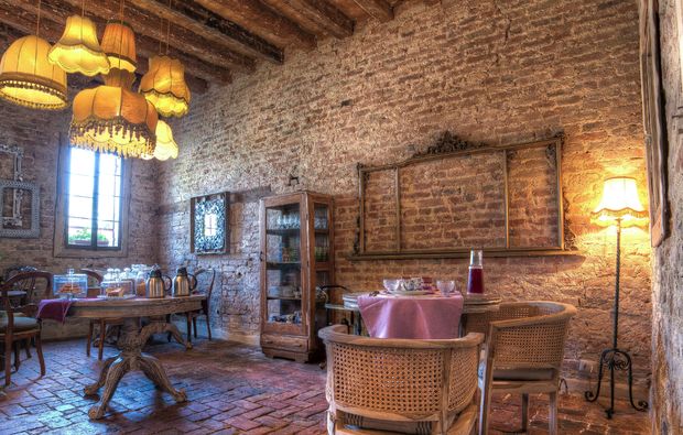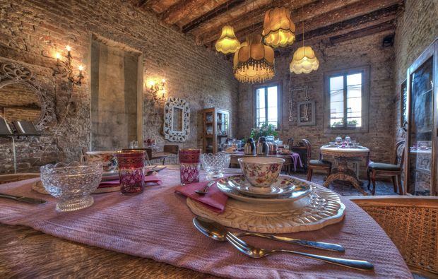 Die versunkene Stadt Venedig ist nicht weit entfernt – und fast scheint es, als würde ihr Zauber bis hierher strahlen. Auf dem großzügigen Areal findet Ihr auch Eure Schlafstätte für diese Nacht: eines von wenigen luxuriösen Lodge Zelten, die sich in großzügigem Abstand auf dem Gelände verteilen. Von außen erscheint es eher wie ein nobler Gartenpavillon in einem englischen Landhaus – einzig das Textildach sowie die Form erinnern noch an ein klassisches Zelt. Im Innern der guten Stube erwartet Euch dann der pure Luxus mit edlem Gehölz, feinen Textilien, einem bequemen Kingsize Bett und allem, was man für eine unvergessliche Nacht braucht. Außerdem genießt Ihr bei Eurer Lodge Tent Übernachtung in Mirano umfassenden Service: Ihr werdet mit einem prickelnden Begrüßungsgetränk in Empfang genommen, bekommt morgens ein klassisch venezianisches Frühstück mit regionalen Produkten serviert und könnt für die Dauer Eures Aufenthalts auf Leihvelos die Gegend unsicher machen. Kurz gesagt: Euch wird es an nichts mangeln!