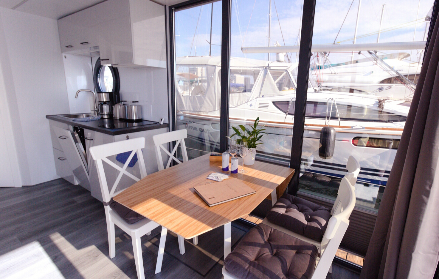 Euer Hausboot ist an maritimem Charme kaum zu überbieten! Dafür sorgt nicht nur das gemütliche Meeresrauschen, sondern auch der offene Grundriss, der großzügige Lichteinfall und nicht zuletzt die voll umfassende Ausstattung mit Küchenzeile, zwei Schlafzimmern und stilvollem Wohnbereich mit Ausziehcouch und Essbereich. Die unangefochtenen Highlights sind jedoch die beiden Sonnenterrassen: Eine fungiert als erweiterter Wohnraum zum Wohnzimmer, die andere befindet sich auf dem Dach und lädt zu ausgedehnten Sonnenstunden ein!