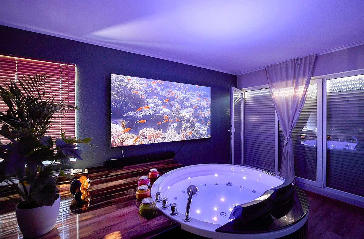 Entspannung trifft auf Romantik: Im stilvoll eingerichteten Wellness Apartment Home of Spa in Mainz taucht Ihr ein in Euren ganz privaten Spa-Bereich – exklusiv nur für Euch zwei. Das Night Spa Mainz bietet Euch Sauna, Whirlpool und Schwebering – ohne fremde Gäste. Die wohlige Wärme des Kamins und die Atmosphäre eines Heimkinos schaffen genau das richtige Ambiente für Eure ungestörte Gemeinsamzeit. Eine voll ausgestattete Küche, liebevoll gewählte Details und ein Balkon für laue Abendstunden runden das Spa für zwei Personen perfekt ab. Nach einer erholsamen Nacht wartet eine leckere Bio Müsli Box zum Frühstück auf Euch. Schafft kostbare Erinnerungen im Private Spa, die noch lange nachklingen. Wie klingt eine Nacht voller Ruhe und Zweisamkeit für Euch?