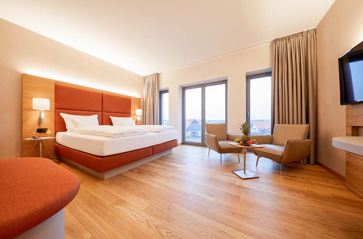 Wenn man romantisch übernachten möchte, würde man sich den Schauplatz dafür wohl kaum schöner träumen können: Euer Romantikwochenende auf Rittergut Störmede führt Euch in eine echte, historische Burgruine, die erstmals im 12. Jahrhundert urkundlich erwähnt wurde. Das gesamte Areal mit seinen einzelnen Gebäudeteilen wird durch einen weitläufigen Park zusammengehalten, der zu romantischen Spaziergängen Hand in Hand einlädt. Mit einer charakteristischen Gräfte, dem Schloss, dem Torhaus und dem Turm kann man hier die bewegte Vergangenheit noch lebhaft spüren! Das Hotel selbst hingegen ist ein hochmoderner Neubau, der mit absolut zeitgemäßem Wohnkomfort aufwartet und Euch alles bietet, was Ihr für ein Kuschelwochenende in Geseke braucht. Bei Eurem Zimmer handelt es sich um ein Komfortdoppelzimmer, das mit Kingsize Bett und großem Flachbildfernseher keine Wünsche offen lässt. Durch die geschmackvolle Gestaltung mit natürlichen Farben und Materialien sowie die bodentiefe Fensterfront herrscht hier eine herrliche Wohlfühlstimmung – perfekt für ein Romantikwochenende auf Rittergut Störmede.