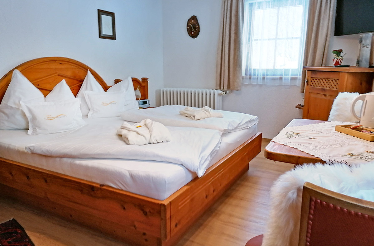 Genießen Sie die herrliche Bergwelt, die glasklare Bergluft und die gemütliche Gastlichkeit, die zum Verweilen einlädt. Schlafen können Sie wahlweise im stilvollen, mit viel Liebe zum Detail eingerichteten Doppelzimmer oder aber ganz abenteuerlich-romantisch direkt im Heu. Es raschelt und es duftet – da kommen Kindheitserinnerungen hoch!