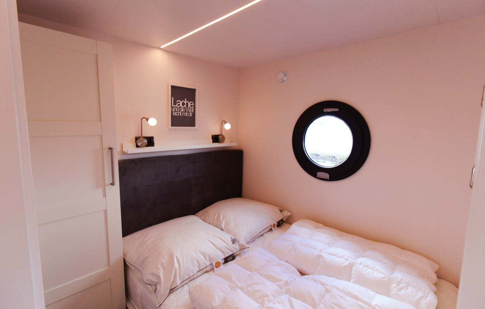 Euer Hausboot erstreckt sich über 50 lichtdurchflutete und offen geschnittene Quadratmeter, die Euch ein kuscheliges Zuhause auf Zeit zu werden – ob mit Kind und Kegel oder ein paar Freunden. Alles, was Ihr braucht, steht Euch bereit: eine vollausgestattete Küchenzeile mit hübscher Essecke, ein kuscheliger Lounge-Bereich mit Ausziehsofa und Meerblick durch bodentiefe Fenster und zwei gemütliche Kojen, also separate Schlafzimmer. Zwei Sonnenterrassen, davon eine auf dem Dach, und eine Sauna bieten Entspannung der Extraklasse!