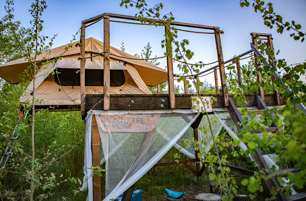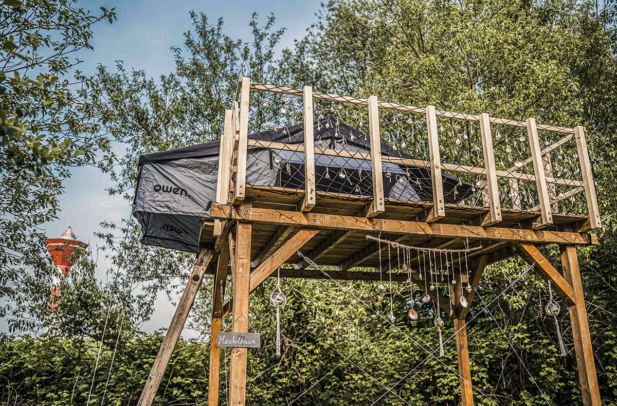 Verbringt zwei Nächte im gemütlichen Dachzelt auf der Plattform Vogelgucker. Das Rauschen der Blätter und die klare Sternennacht schaffen eine unvergessliche Atmosphäre. Die Feuerstelle lädt dazu ein, abends zusammenzusitzen und Geschichten zu erzählen, was den Natururlaub perfekt abrundet.