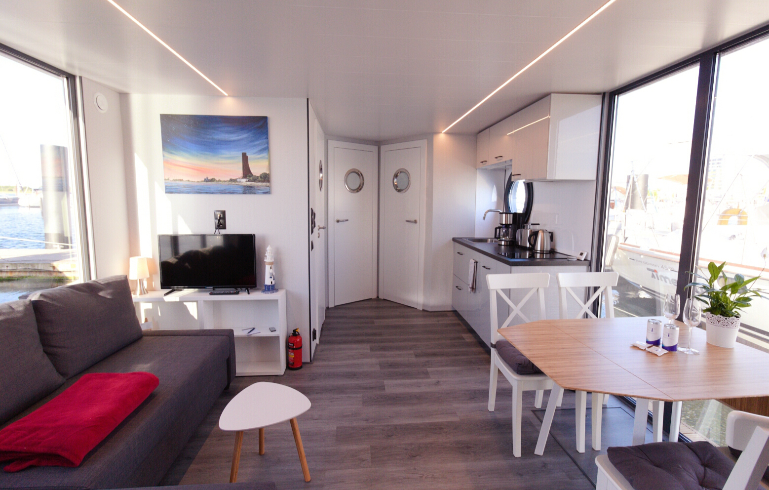 Euer Hausboot ist an maritimem Charme kaum zu überbieten! Dafür sorgt nicht nur das gemütliche Meeresrauschen, sondern auch der offene Grundriss, der großzügige Lichteinfall und nicht zuletzt die voll umfassende Ausstattung mit Küchenzeile, zwei Schlafzimmern und stilvollem Wohnbereich mit Ausziehcouch und Essbereich. Die unangefochtenen Highlights sind jedoch die beiden Sonnenterrassen: Eine fungiert als erweiterter Wohnraum zum Wohnzimmer, die andere befindet sich auf dem Dach und lädt zu ausgedehnten Sonnenstunden ein!