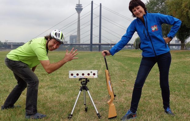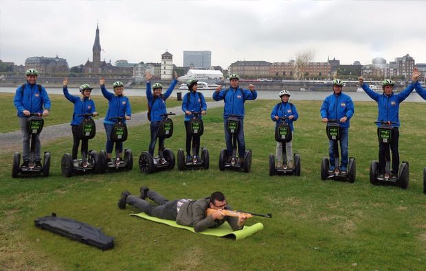 Du bist immer auf der Suche nach neuen sportlichen Herausforderungen? Wie wäre es dann mit einer Segway Biathlon Tour in Düsseldorf? Hier kannst Du Dein ganzes Geschick unter Beweis stellen, wenn Du den Segway bezwingst und zudem noch versuchst, beim Schießen ins Schwarze zu treffen. Zu Beginn des zweistündigen Erlebnisses erwartet Dich erst einmal eine professionelle Fahreinweisung durch einen Tourguide. Dieser zeigt Dir, wie Du mithilfe bestimmter Bewegungen nicht nur das Tempo, sondern auch die Richtung verändern kannst. Das Fahren mit dem Segway erscheint auf den ersten Blick wohl ein Stück weit ungewohnt und stellt Deine motorischen Fähigkeiten auf die Probe, doch sobald Du den Dreh heraus hast, erwartet Dich jede Menge Fahrspaß, wenn Du gekonnt über den Asphalt gleitest. Freue Dich auf spannende Stunden auf diesem etwas anderen Gefährt, das Du extra für diese Zeit gestellt bekommst. Sobald Du Herr über den Segway geworden bist, beginnt auch schon die eigentliche Segway Biathlon Tour in Düsseldorf. In Begleitung eines ortskundigen Instruktors besuchst Du die Vielzahl an lokalen Sehenswürdigkeiten und kannst einmal an ihnen vorbeigleiten. So wirst Du bestimmt jede Menge neidvoller Blicke auf Dich ziehen und dieses außergewöhnliche Erlebnis noch intensiver genießen. Natürlich beinhalten die zwei Stunden nicht nur das Sightseeing der besonderen Art, sondern auch spezielle Schießübungen. Diese Prüfungen finden unterwegs immer wieder an mobilen Schießanlagen statt, auf die Du mit einem Laser Gewehr schießen darfst, um Dein Können zu beweisen. Wie oft triffst Du ins Schwarze und reicht es für die Siegerurkunde? Denn nur, wenn Du alle anderen hier abhängen konntest, erwartet Dich am Ende die Urkunde, die Du voller Stolz entgegennehmen darfst und die Dich für immer an dieses einmalige Ereignis erinnern wird. Na? Ist nun Dein sportlicher Eifer geweckt? Dann auf zur Segway Biathlon Tour in Düsseldorf. Erlebe aufregenden Fahrspaß und beweise ein gutes Auge bei der Segway Biathlon Tour in Düsseldorf für unvergessliche Höhepunkte.