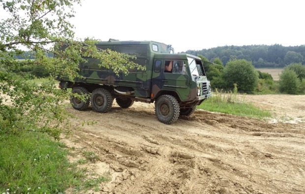 Beim Geländewagen fahren in Großmehring erwartet Dich ein ganz besonderes Schmankerl. Der Volvo C306, besser bekannt als Volvo Lappländer, ist ein schwedisches Militärfahrzeug aus den 70er Jahren. Ursprünglich wurde er zu militärischen Zwecken, wie zum Beispiel den Truppentransport, in der königlichen schwedischen Armee verwendet. Heute kannst Du damit durchs Offroad-Paradies brettern. Drei Achsen, sechs Räder und Allradantrieb machen ihn zu einem 6x6, mit dem sich so gut wie jedes Terrain bewältigen lässt. Klingt gut? Dann überzeuge Dich im Praxistest selbst von der Geländegängigkeit dieses Kraftpakets.