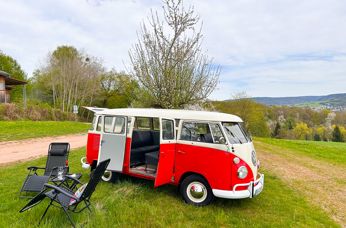 Ein liebevoll restaurierter VW Bulli wartet auf Dich, um Dich sanft durch die sanften Hügel und tiefen Wälder des Spessarts zu tragen. Entspannt folgst Du einem handverlesenen Routenvorschlag, der Dich durch den idyllischen Kahlgrund führt, vorbei an verwunschenen Tälern bis hin zum prächtigen Schloss Johannisburg. Mit an Bord ist alles, was Du für eine stilvolle Picknicktour brauchst: Picknickkorb, Stühle, Tisch und Decke – perfekt für eine Pause auf einer einsamen Wiese unter freiem Himmel. Die 50 Freikilometer schenken Dir die Freiheit, in Deinem Tempo unterwegs zu sein. Lass Dich vom Charme des Bullis verzaubern und mach Dich auf den Weg zu Momenten, die lange in Erinnerung bleiben.
