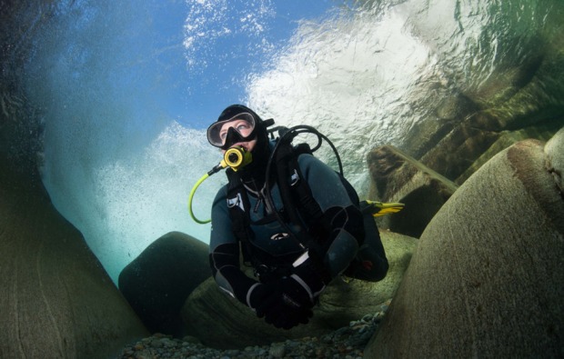 Bei der professionellen Einführung ins Bergsee-Tauchen, erhältst Du eine theoretische Einweisung. Du lernst auch, worauf Du beim Tauchen im Blindsee achten musst. Ist die Ausrüstung erstmal angepasst, so geht es für Dich los und Du machst Deine ersten Atemzüge unter Wasser.