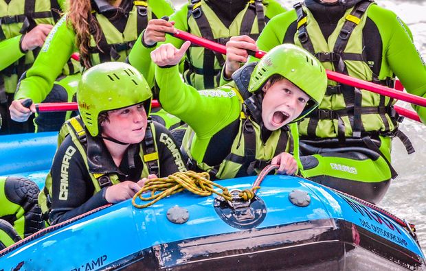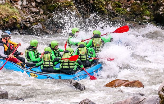 In Haiming angekommen, wirst Du von dem erfahrenen Action-Profi herzlich in Empfang genommen und dann lernst Du auch schon die anderen Teilnehmer kennen. Genug gequatscht, beim Canyoning-Package ist keine Zeit zu verlieren: Der Erlebnistag startet mit der Rafting-Tour. Bevor es damit losgeht, wirst Du mit einem Neoprenanzug, Neoprenschuhen, einer Schwimmweste und einem Helm ausgestattet, damit beim Rafting nichts schief gehen kann. Bist Du dann mit den anderen Teilnehmern an der Einstiegsstelle angekommen, erklärt der Profi Euch bei der Einweisung, was Ihr beim Rafting so alles zu beachten habt: Ihr lernt, wie man im Boot sitzt, das Paddel hält und sich bei Strömungen verhält. Dann nichts wie los mit der Spritztour: Rund 3 Stunden geht es nun ab über den Inn und durch die Imster Schlucht, wo Wellen und Stromschnellen stets für puren Wasserspaß sorgen!