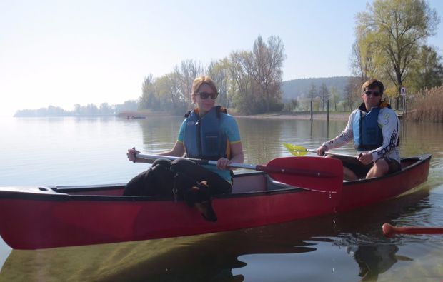 Habt Ihr Euren gemütlichen Platz im Kanu gefunden? Dann könnt Ihr endlich ablegen! Schon nach wenigen Paddelschlägen befindet Ihr Euch auf dem offenen Wasser und nehmt die besonderen Sinnesreize, die es nur beim Kanufahren am Bodensee in Moos in dieser Form zu erleben gibt, wahr. Lasst Euch von der endlosen Weite des Wassers, dem leisen Rauschen des Windes, der bezaubernden Färbung des Himmels und der entspannten Ruhe um Euch herum verzaubern, während die Sonne langsam im Wasser versinkt ... Irgendwann ist dann der richtige Moment gekommen, um die Gläser zu heben und auf das romantische Erlebnis anzustoßen. Wann es soweit ist, werdet Ihr ohne Zweifel spüren! Schon wenig später stehen dann die Sterne am Himmel und weisen Euch den Weg durch das Wasser. Euer Guide steht Euch darüber hinaus natürlich ständig zur Verfügung, sodass Ihr unterwegs garantiert nicht die Orientierung verliert. Viel zu schnell führt Euch die Kanuroute dann auch schon wieder zurück zum Ausgangspunkt in Moos. Zum Glück sind Wiederholungen kein Problem! Ihr seid bereit für eine traumhafte Kanutour zu zweit? Genießt das Kanufahren am Bodensee!