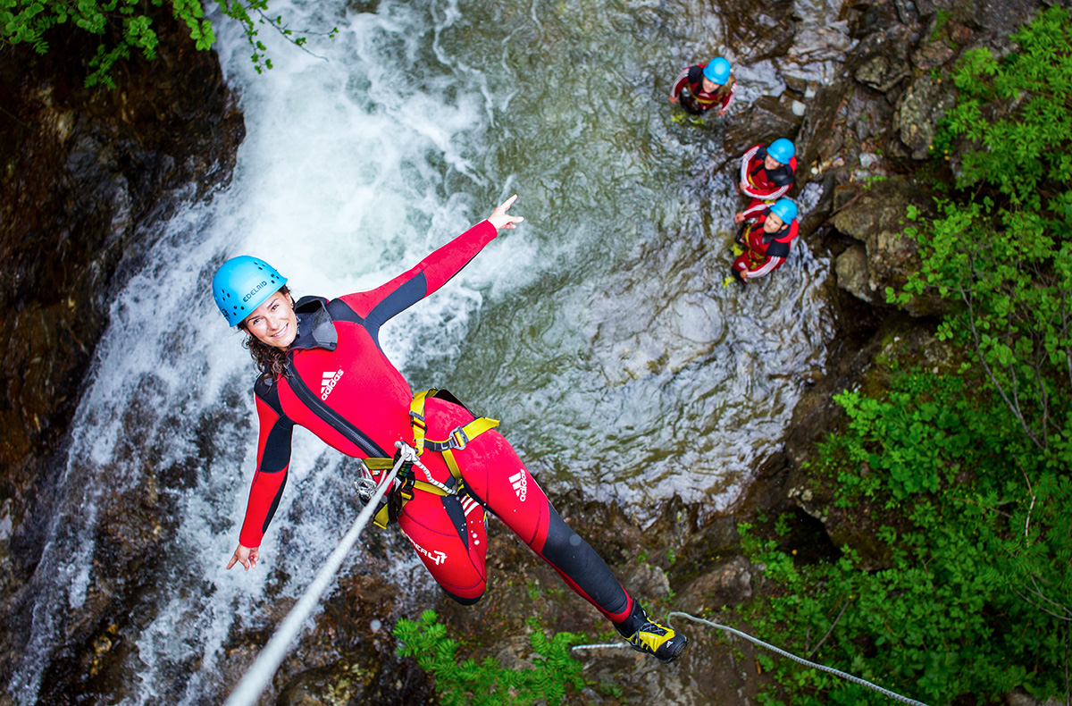 Danach geht es in die atemberaubende Schlucht. Mit Neoprenanzug und Helm ausgestattet, machst Du Dich auf den Weg hinab. Eine umfassende Einweisung versorgt Dich mit allem notwendigen Wissen. Anschließend beginnt das Abenteuer. Du bewegst Dich entlang des Flusses, überwindest Sprünge, gleitest über von der Natur geschaffene Wasserrutschen hinab und kletterst durch herausfordernde Passagen.