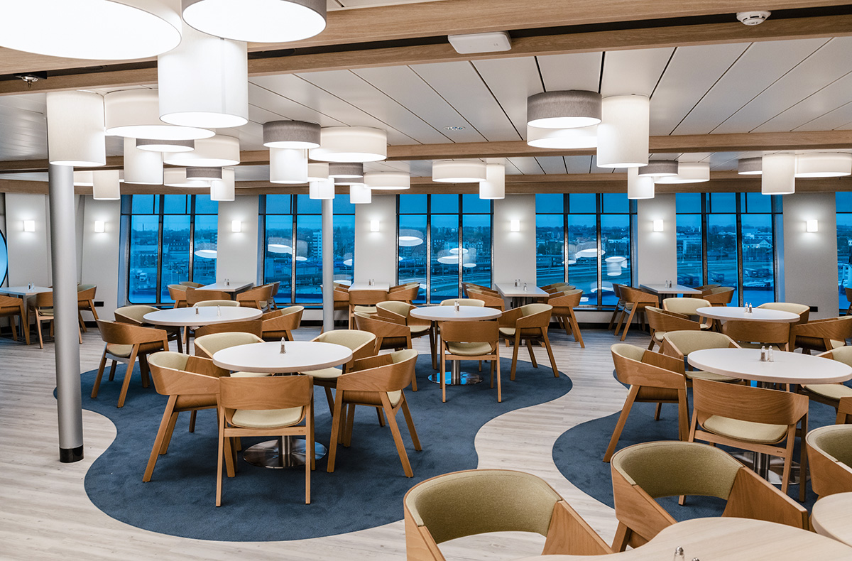 Mittagessen im Bordrestaurant oder der Cafeteria auf der Hinfahrt