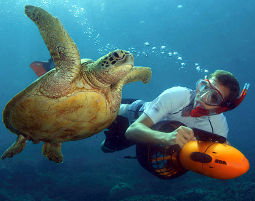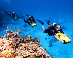 Entdecke im nassen Element das “Easy-Rider-Feeling“ und lerne das coole Fahrzeug besser kennen. Ausgestattet mit einer Leihausrüstung absolvierst Du unter fachkundiger Betreuung Deine ersten Übungen und bekommst ein Gefühl für das Gerät. Mit dem Scooter kannst Du Dich unter Wasser doppelt so schnell fortbewegen, wie mit Flossen, und fühlst Dich dabei, als würdest Du durch den Weltraum fliegen. Sause durch die Tiefe, probiere gewagte Manöver und veranstalte zum Abschluss ein unvergessliches Unterwasser-Wettrennen.