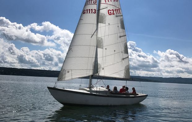 Der Segelkurs dauert vier Tage lang und findet an zwei Wochenenden statt. Der Unterricht startet jeweils um 9:00 Uhr und endet um 16:00. Zwischendrin hast Du bei einer einstündigen Mittagspause Zeit, Dich zu stärken. Hast Du den Steg der Segelschule in Utting am Ammersee am Samstagmorgen erreicht, wirst Du vom Segellehrer herzlich in Empfang genommen. Der Segellehrer ist sehr professionell und bringt jede Menge Erfahrung mit. Der Segelkurs startet sofort an Bord, wo Deine Ausbildung beginnt. Du lernst alles über Kurshalten, Kurse fahren, Kommandos geben, Wenden, Halsen, etc.. Wenn Du noch weitere Fragen rund um das Segeln hast, beantwortet der Profi sie Dir gerne. Der Lehrer ist dabei immer mit an Bord, kann Dir individuelle Tipps geben und sich auf Deine Segelkenntnisse einstellen.