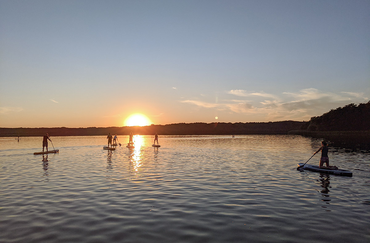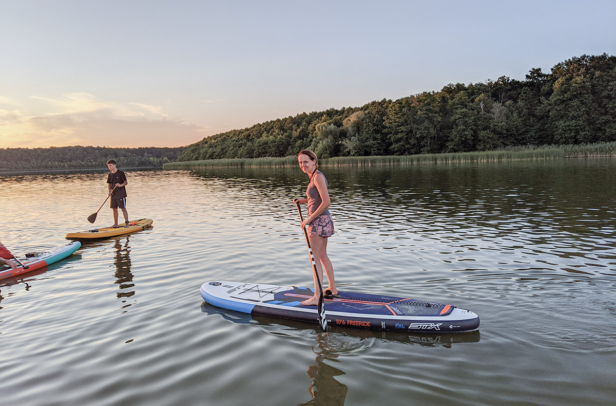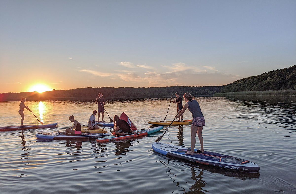 Du und Deine Erforschungsgruppe machen sich zur geführten Stand Up Paddling-Tour in Brandenburg auf den Weg. Stehpaddeln wurde in den letzten Jahren immer beliebter und ist eine echte Trendsportart. Du stehst zum ersten Mal auf einem SUP? Ein erfahrener Trainer bringt Dir das Aufstehen und Paddeln in kurzer Zeit bei. Nun stehst Du hüftbreit und sicher auf dem Brett. Mit ein bisschen Übung beherrschst Du das Stechpaddel mit der 3-Phasen-Technik für das Lenken und Fortbewegen.