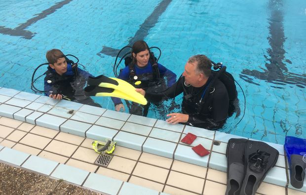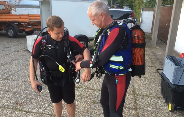 Unter professioneller Anleitung machst Du Deine ersten Taucherfahrungen. Nach einer theoretischen Einweisung in das Tauchgerät legst Du die Ausrüstung an.