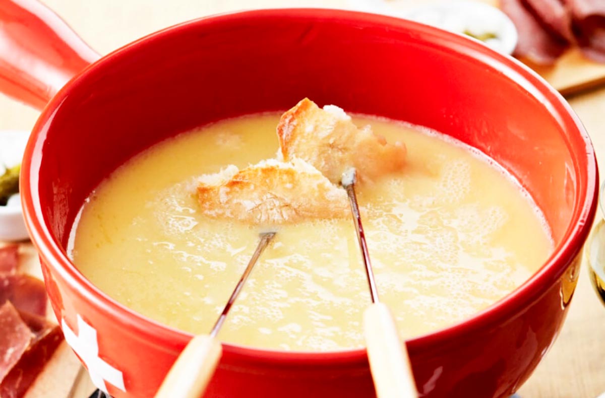 Das Fondue enthält Rohmilchkäse und Weißwein. Auf Wunsch kann ein alkoholfreies Rezept zubereitet werden
