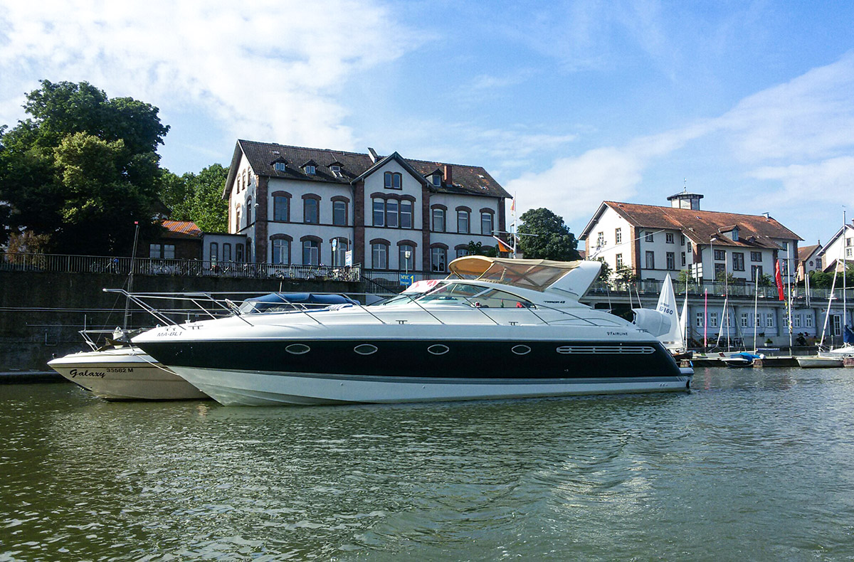 An der Hafenmauer im rheinland-pfälzischen Speyer erwartet Dich eine vollgetankte 13 Meter Fairline Yacht. Normalerweise siehst Du Boote in dieser Größe nur im Meer. Du bekommst das Privileg, damit auf dem Rhein zu fahren. Dein Ziel ist die Blaue Lagune. In das Naturschutzgebiet dürfen nur sehr wenige Motorboote fahren. Deines ist eines davon.