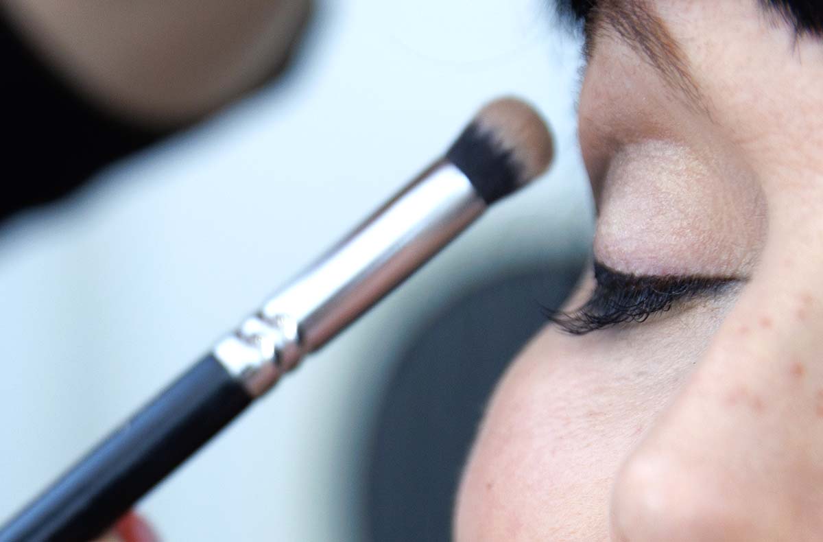 Step-by-Step Anleitung an einer Person: eine Gesichtshälfte wird vor geschminkt, dann nach geschminkt (die anderen schminken sich unter Anleitung selbst)