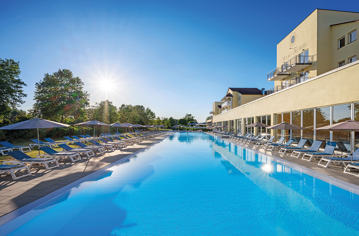 - Freie Nutzung des 1.400 m² großen Wellnessbereichs mit Freibecken, Solarium, Wasser- und Wärmebetten und Entspannungsliegen