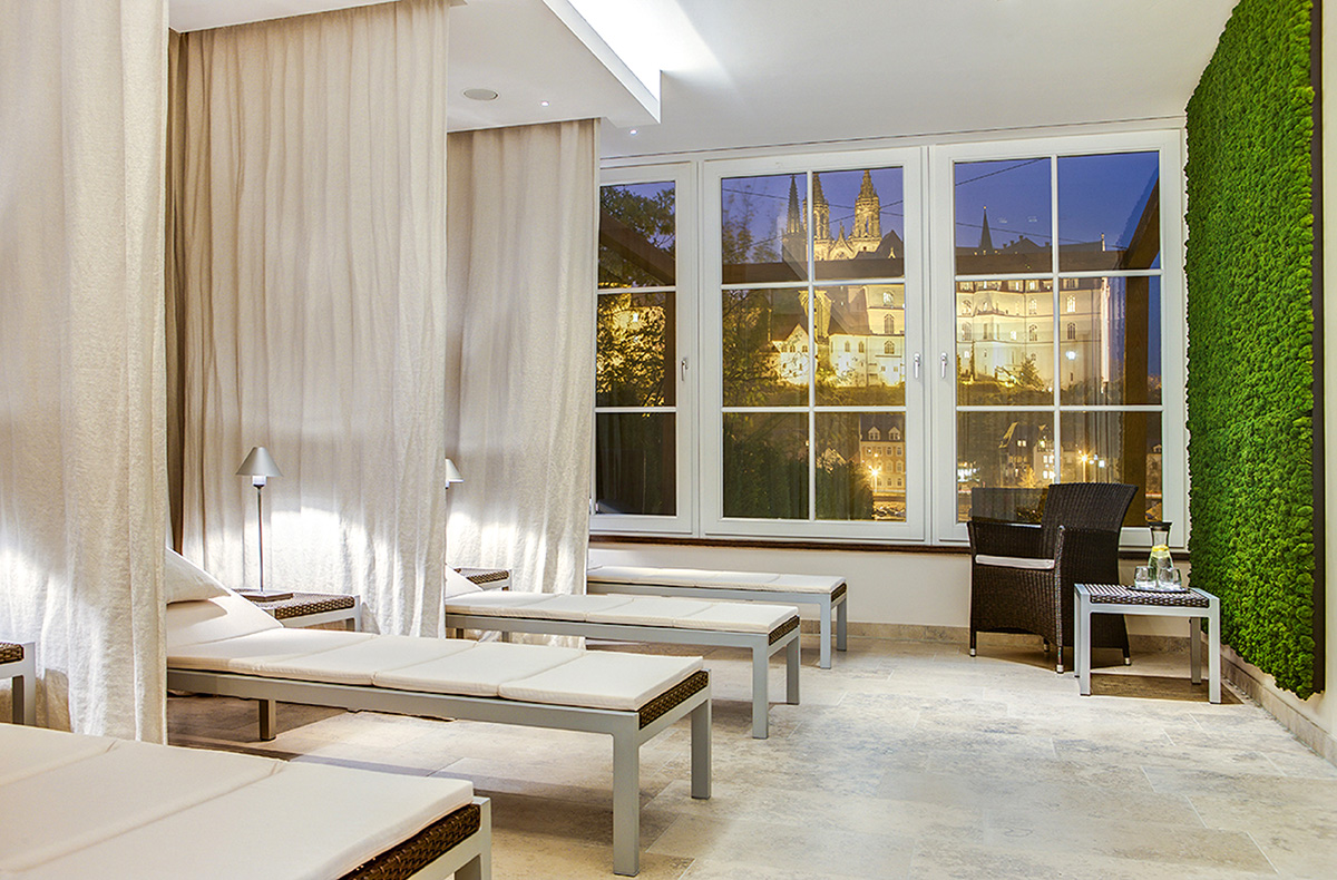 Und dann kann es auch schon losgehen: Wenn Ihr den Spa-Bereich betretet, werdet Ihr für einige Momente von dem Anblick überwältigt sein. Kontrastreich und atmosphärisch gestaltet sich das elegante Wellnesszentrum. Der Ruhebereich ist genauso wie die Saunalandschaft mit Panoramafenstern ausgestattet. Hier schwitzt man in lichtdurchflutetem Ambiente und mit Weitblick auf den Dom zu Meißen und die Albrechtsburg – ein einmaliges Erlebnis. Nach muckeligen Momenten in der Sauna bietet Euch der Eisbrunnen die ersehnte Abkühlung. Außerdem könnt Ihr auch auf der Sonnenterrasse bei einem Vitalsnack mit Getränk die herrliche Aussicht genießen. Doch das ist noch lange nicht alles, was Euch an Eurem Wellnesstag für Zwei in Meißen erwartet. Jeder von Euch genießt außerdem eine dreißigminütige Entspannungsmassage. Unter den gekonnten Handgriffen der Experten wird hierbei auch die letzte Verspannung von Euch weichen.