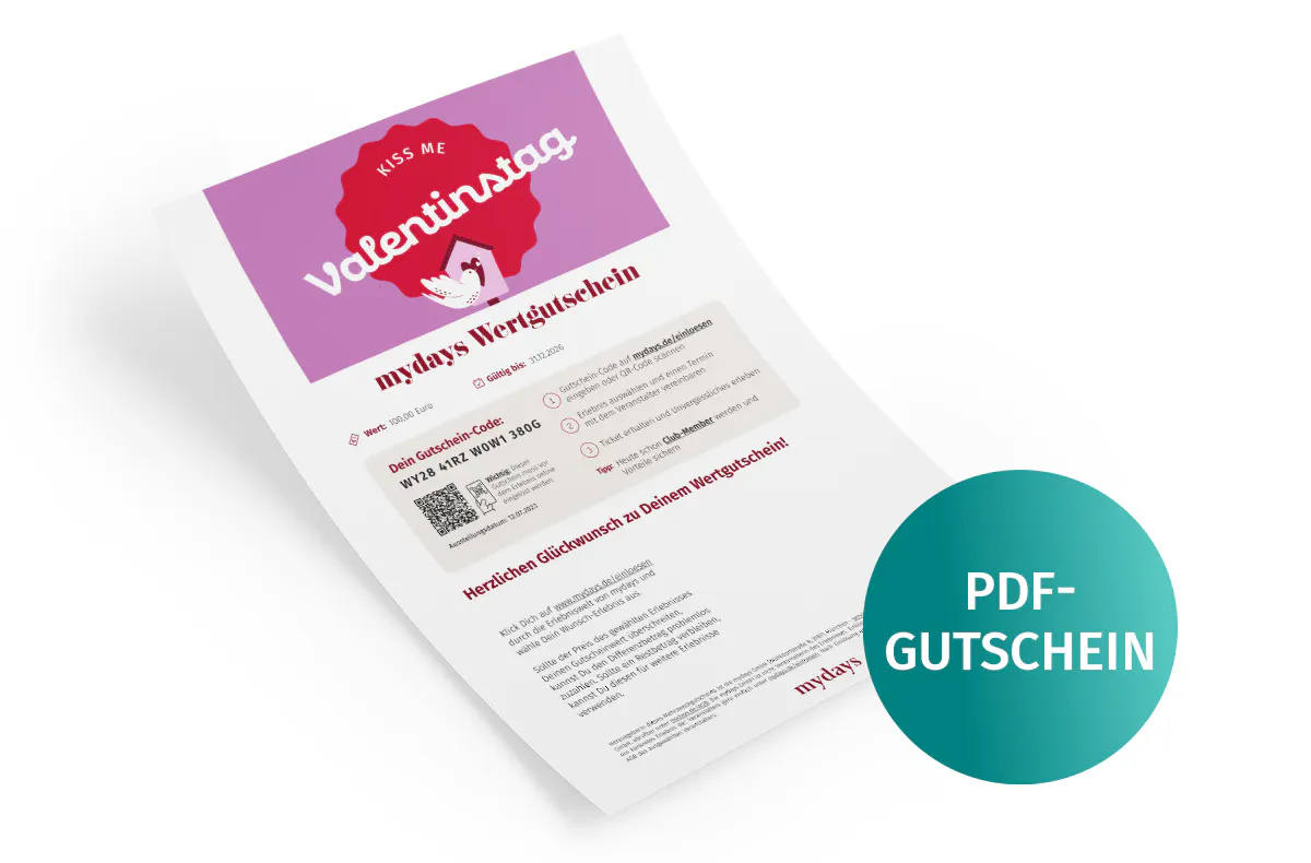 * Dieses Sonderangebot gilt nur vom 23.03.2026 bis einschließlich 06.04.2026 bei Kauf eines entsprechend gekennzeichneten mydays Gutscheins. Pro Bestellung nur ein Rabattcode einlösbar. Nicht kombinierbar mit anderen Rabattaktionen bzw. bereits reduzierten Produkten. Nicht möglich sind die Anrechnung auf Versandkosten, Geschenkverpackung, einen Wertgutschein und mydays Gutscheine mit direkter Buchung eines konkreten Termins sowie eine nachträgliche Einlösung oder Barauszahlung. Der Weiterverkauf ist untersagt. Es gelten die AGB der mydays GmbH.